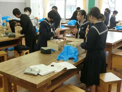 1年生の授業の様子を紹介します。 【写真上:家庭科】 【写真中:英語】 【写真下:技術】