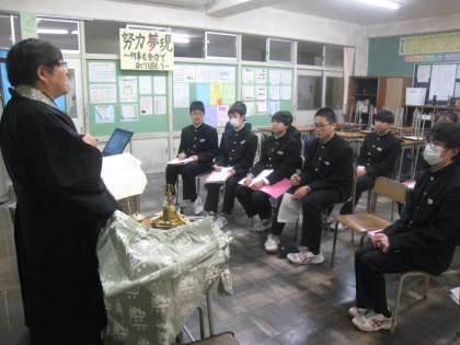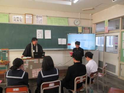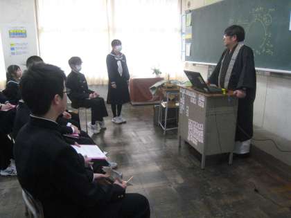 8日(金)働く人に学ぶ会【1学年】その3 公開日 2024/03/08 更新日 2024/03/08 1学年 本日5・6限に「働く人に学ぶ会」を行いました。 仕事のやりがいや適性、中学生へのアドバイスをお話していただきました。 【写真:僧侶】