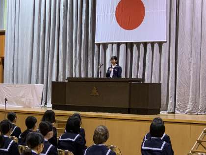 生徒会副会長から記念品が授与された後、代表生徒から記念品授与へのお礼が述べられました。
