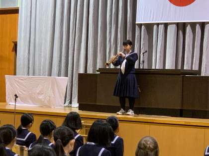 県中学校文化連盟に表彰された吹奏楽部の2名は、表彰後に実際の演奏も披露しました。