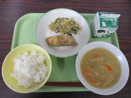 13日(水) きょうの給食 公開日 2024/03/13 更新日 2024/03/13 今日の給食 今日の給食を紹介します。上左から 平皿(はりはり炒め、ふくらぎのかば焼き) 牛乳 五目汁 ごはん 今日は3年生にとって最後の給食でした。小学校も合わせると義務教育9年間の給食でした。卒業を機に、長きにわたっていただいてきた給食へも改めて感謝ですね。