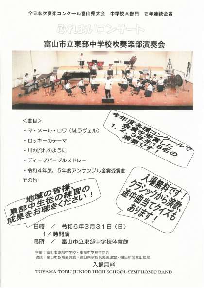 地域の皆様、保護者の皆様、卒業された3年生、1、2年生の皆さん、私たちの演奏を聴いて、4月1日からがんばっていただけるような元気の出る演奏をしたいと思います。