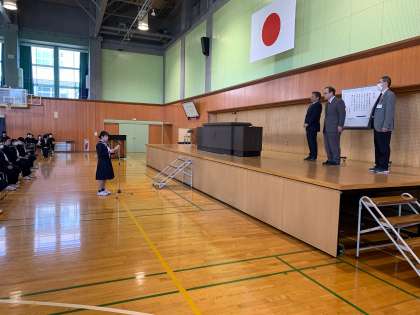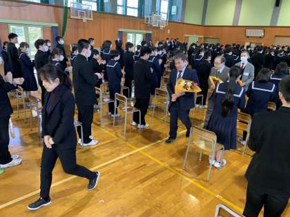 22日(金) 退任式・離任式 その2 公開日 2024/03/22 更新日 2024/03/22 東部中学校の様子 生徒代表からの謝辞の後、退任・離任される先生方に花束が手渡されました。 そして、生徒全員で退場される先生方を拍手で見送りました。