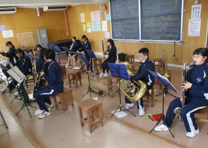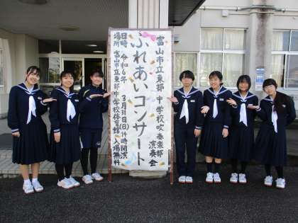 27日(水)ふれあいコンサートに向けて 公開日 2024/03/27 更新日 2024/03/27 部活動の様子 3月31日(日)に「ふれあいコンサート」を体育館で開催します。吹奏楽部が熱心に練習しています。看板は美術部が制作しました。地域の方々のたくさんのご来場をお待ちしております。入場は無料です。