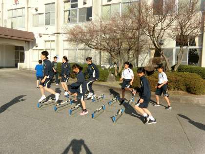 1年生が部活動体験をしています。 【写真上:剣道部】 【写真中:陸上競技部】