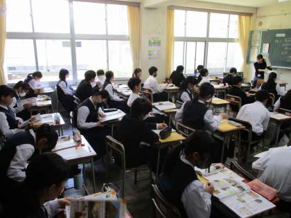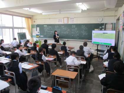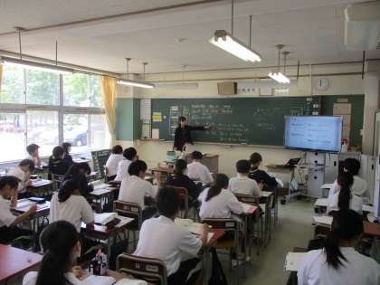 1年生の授業の様子を紹介します。 【写真上】:英語 【写真中】:数学 【写真下】:社会