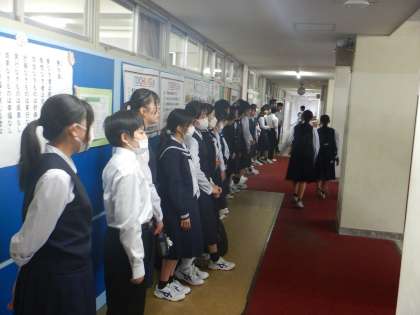 27日(月) 東中グリーティングウィーク【生徒会執行部】 公開日 2024/05/28 更新日 2024/05/28 生徒会 本日も朝の挨拶運動を実施しています! 本日より1年生が行っています! 初々しい和やかな挨拶が飛び交っていました。
