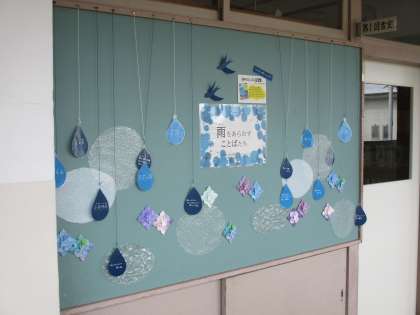 6月に向けて 図書室前の掲示 公開日 2024/05/29 更新日 2024/05/29 東部中学校の様子 今週末から6月。梅雨の季節に向けて、図書室前に「雨をあらわすことばたち」が掲示されています。 雨粒一つ一つに書かれたことばの意味が知りたい人は、ひっくり返してみてください。