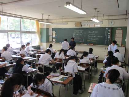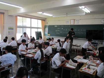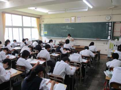 1年生の授業の様子を紹介します。 【写真上】:英語 【写真中】:家庭科 【写真下】:道徳