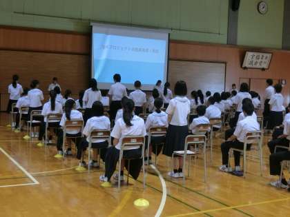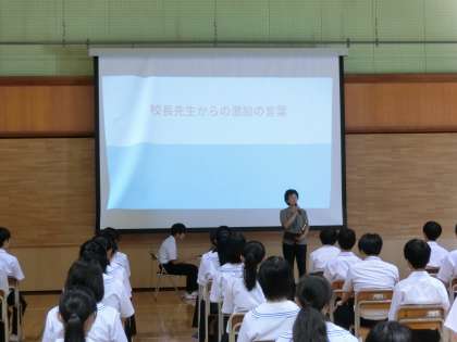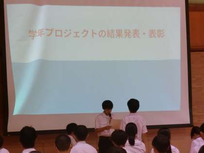 27日(木)14歳の挑戦 結団式【2学年】 公開日 2024/06/27 更新日 2024/06/27 2学年 2年生は7月1日(月)〜5日(金)に、「社会に学ぶ14歳の挑戦」を実施します。 実行委員会が企画・運営し、結団式を行いました。 【写真上:学年プロジェクト個人表彰】 【写真中:学年プロジェクト学級表彰】 【写真下:激励の言葉】