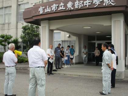 25日(木)第2次避難所開設訓練 公開日 2024/07/25 更新日 2024/07/25 東部中学校の様子 25日(木)市防災危機管理課、市役所、地区センターの方々に来校いただき、第2次避難所開設訓練を実施しました。 建物の外観確認、建物内の確認を行った後、受付設置、滞在スペースの作成など、実際の手順に沿って訓練を進めました。 はじめての訓練でしたが、中学校が第2次避難所として地域住民の方々を受け入れるためには、どのような手順や準備が必要か、教職員は真剣に確認しました。