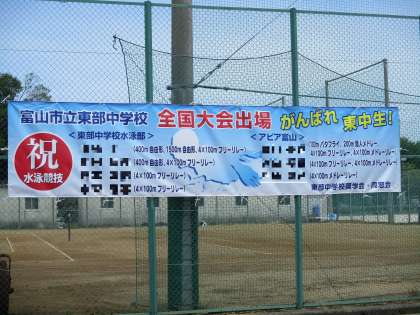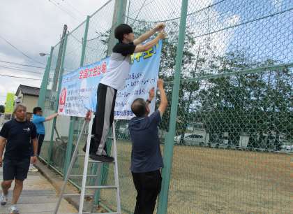 全国大会に出場する選手を応援する横断幕をテニスコート南側に掲げました。