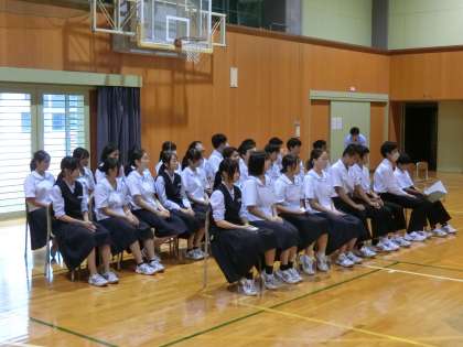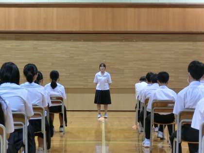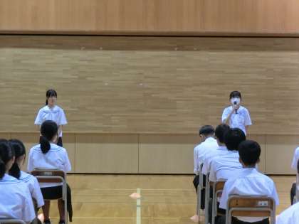 立候補者が「どんな体育大会にしたいか」と「そのために、どんなことを頑張りたいか」を2学年生徒の前で発表しました。「自分が団を引っ張りたい」という気持ちを、立候補者は言葉と態度で示しました。