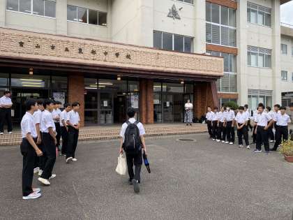 11日(水)東中グリーティングウィーク 公開日 2024/09/11 更新日 2024/09/11 生徒会 10日(火)〜20日(金)の期間、部活動ごとに生徒玄関前で朝のあいさつ運動を行っています。11日(水)の担当は男子バスケットボール部で、大きな声であいさつをしていました。明日12日(木)の担当は、男子バドミントン部と剣道部です。