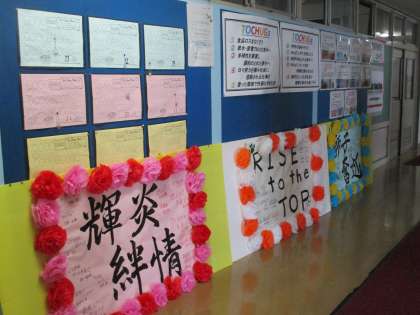 生徒玄関前の廊下には、各団のスローガンが掲示されました。