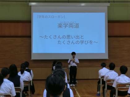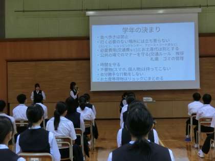 学年生徒会がスローガンを発表し、学年のきまりや服装・持ち物について確認しました。