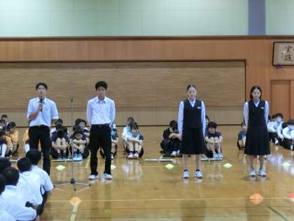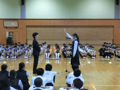 8日(火)部活動壮行会 その5 公開日 2024/10/09 更新日 2024/10/09 生徒会 富山市中学校新人大会と県ジュニアオリンピック中学校陸上競技大会の壮行会を行いました。 【写真上:決意表明(水泳部)】 【写真中:生徒会長の言葉】 【写真下:選手宣誓】