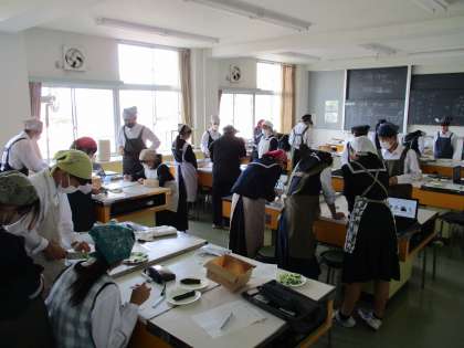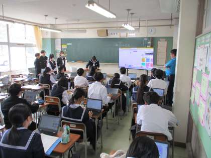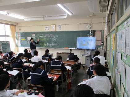 1年生の授業の様子を紹介します。 【写真上】:学活 【写真中】:家庭科 【写真下】:英語
