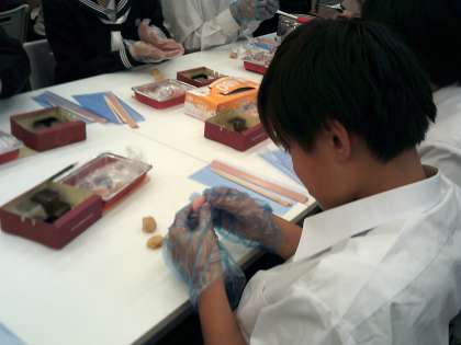 8日(金)2学年校外学習(体験活動) 公開日 2024/11/08 更新日 2024/11/08 2学年 午後は、石川県観光物産館にて体験活動を行いました。 【写真上:和菓子作り】 【写真下:金箔貼り】
