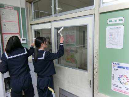 22日(金)重点清掃・ちょこっと整頓【環境委員会】 公開日 2024/11/22 更新日 2024/11/22 生徒会 今日の重点清掃場所は、教室出入り口の窓でした。 窓用スイーパーを用いて、窓に付いた手脂をきれいにしました。 また、清掃後には、雑巾かけを整頓しました。
