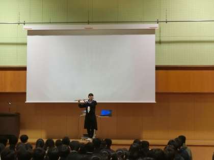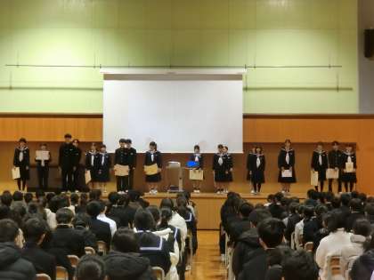 24日(火)受賞報告 公開日 2024/12/24 更新日 2024/12/24 東部中学校の様子 終業式に先立ち、受賞報告がありました。 運動部の市や県の大会、吹奏楽部や美述部のコンクール、科学展覧会や思考大会等で受賞した生徒を紹介しました。 また、受賞した吹奏楽部の代表生徒がフルート演奏しました。 【写真上:受賞報告1】 【写真中:受賞報告2】 【写真下:代表生徒によるフルート演奏】