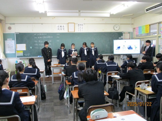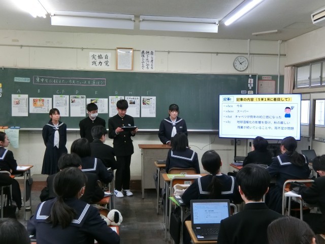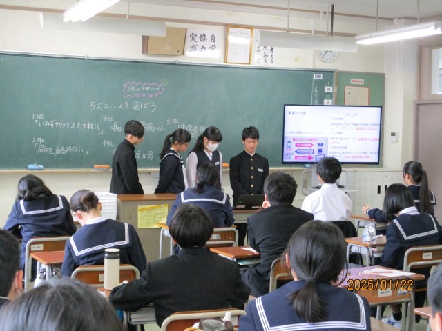 本日は「東中生に紹介したい新聞記事」を学級に向けて発表し、各学級で5大ニュースとしてまとめました。