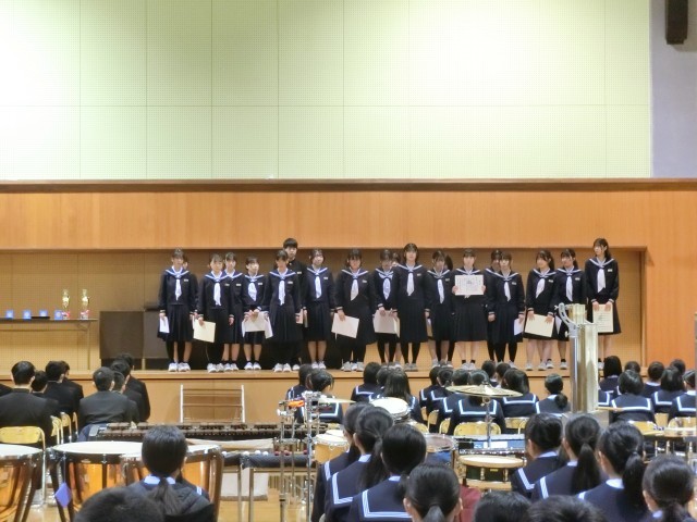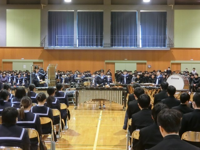 11日(火)受賞伝達 公開日 2025/03/11 更新日 2025/03/11 東部中学校の様子 3学期の受賞伝達を行いました。また、アンサンブルコンテストで受賞した吹奏楽部の打楽器五重奏の演奏を聴きました。