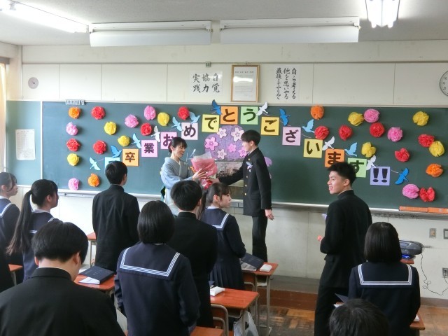 13日(木)最後の学活【31H】 公開日 2025/03/13 更新日 2025/03/13 東部中学校の様子 1年間を過ごした教室での最後の学活です。代表生徒が担任に感謝を伝え、生徒全員で歌をプレゼントしました。 卒業生の皆さんのこれからの前途に幸あれ!本当におめでとう!!