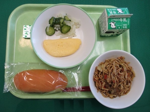 15日(火)今日の給食 公開日 2025/04/15 更新日 2025/05/04 東部中学校の様子 今日の献立は、「コッペパン(減)、牛乳、オムレツ、焼きそば、えごまドレッシングサラダ、ポケットチーズ」でした。「焼きそば」は、柔らかい麺と具材にソースが香ばしく、とてもおいしかったです。