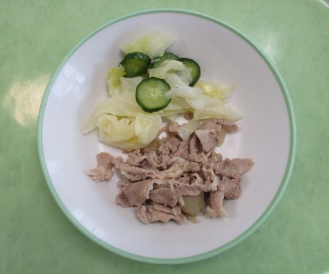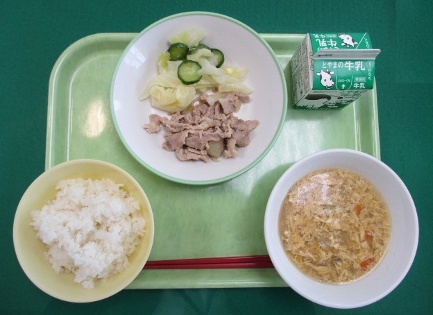 今日の献立は、「ごはん、牛乳、豚肉の塩こうじ炒め、きざみ和え、中華かきたま汁」でした。