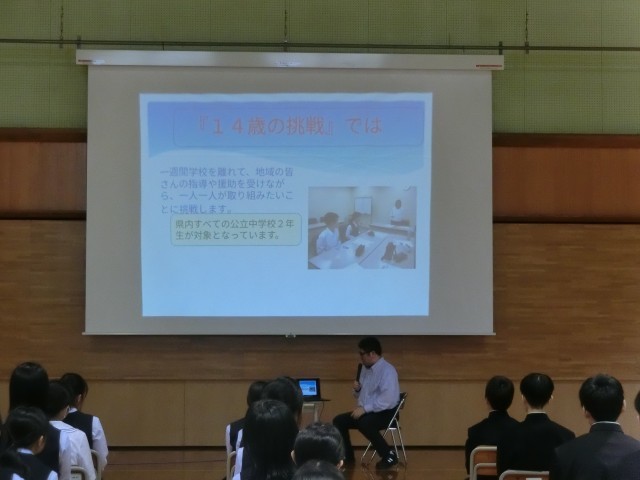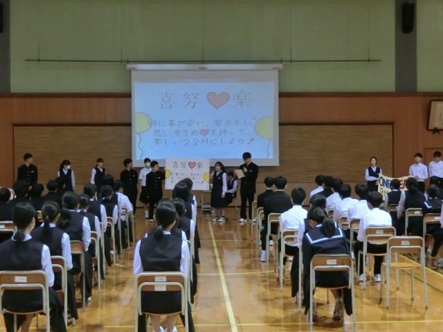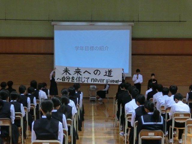 28日(月)学年集会【2学年】 公開日 2025/04/28 更新日 2025/04/28 2学年 2年生は、本日5限に学年生徒会企画・運営で、学年集会を行いました。各学級の学級組織を紹介し、学年目標と学級目標の発表をしました。最後に、6月30日(月)~7月4日(金)に実施する「社会に学ぶ14歳の挑戦」について、説明がありました。