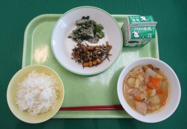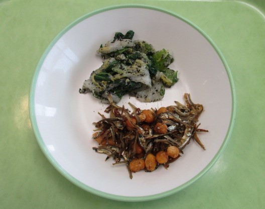 今日の献立は、「ごはん、牛乳、小魚入りフライビーンズ、よごし、南蛮煮」でした。