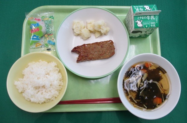 今日の献立は、「ごはん、牛乳、鯉のぼりハンバーグ、こふきいも、若竹汁、かしわもち」です。