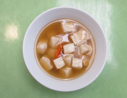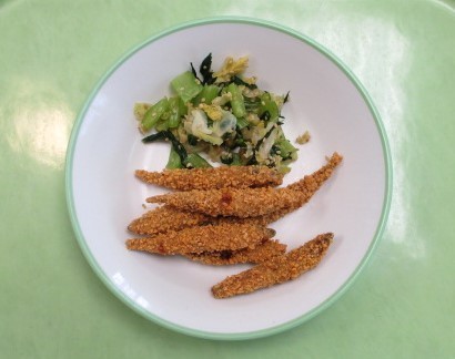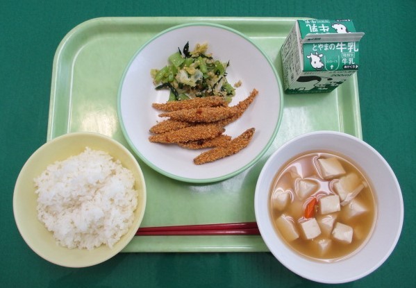今日の献立は、「ごはん、牛乳、きびなごのさくさく揚げ、ごまびたし、白玉汁」でした。