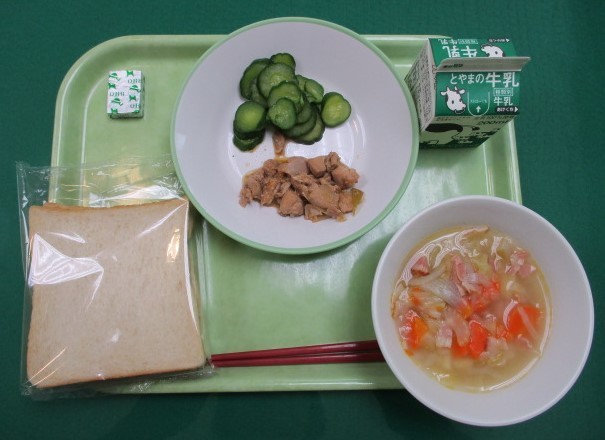 今日の献立は、「食パン、牛乳、あっさりチキン、きゅうりもみ、野菜のスープ煮、ポケットチーズ」でした。