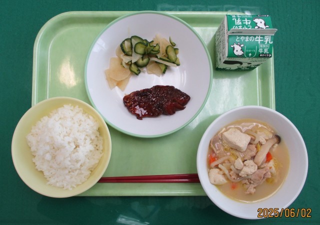 2日(月)今日の給食 公開日 2025/06/02 更新日 2025/06/02 東部中学校の様子 今日の献立は、「ごはん、牛乳、赤魚の照り焼き、酢の物、肉豆腐」でした。「肉豆腐」は、すき焼き風の甘めの味付けになっていて、とてもおいしかったです。