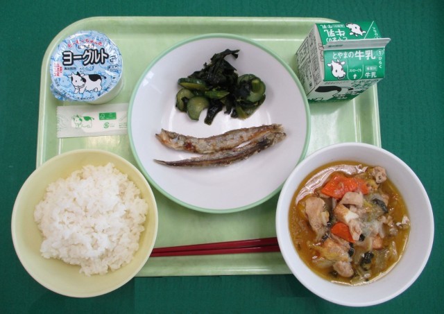 今日の給食には、カルシウムがたくさんとれるよう、「ししゃも」や「ヨーグルト」も使われています。栄養バランスのよい給食をおいしく食べて、丈夫な骨や歯をつくりましょう。