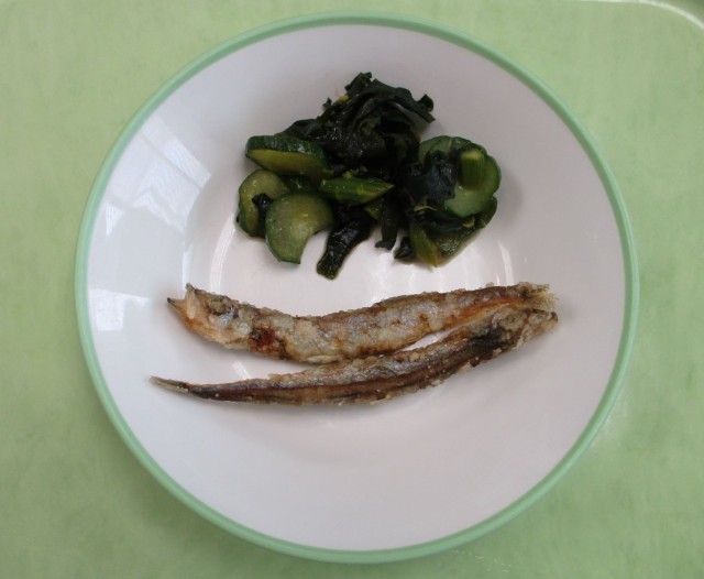 今日の献立は、「ごはん、牛乳、ししゃものから揚げ、わかめの中華あえ、厚揚げのみそ炒め、ヨーグルト」でした。