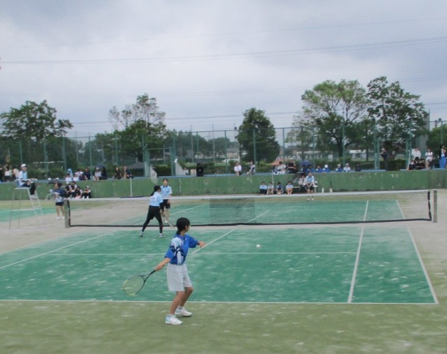 岩瀬テニスコートで行われた団体戦1回戦、八尾中学校との対戦の様子です。