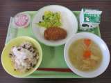 今日の給食を紹介します。上左から  甘平  平皿(グリーンサラダ、コロッケ)  ...