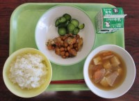 今日の献立は、「ごはん、牛乳、ホキとひよこ豆の甘からめ、きゅうりもみ、けんちん汁」でした。「けんちん汁」は、ごま油で具材が炒めてあり、香ばしいごま油と干ししいたけの風味が効いていて、とてもおいしかった...