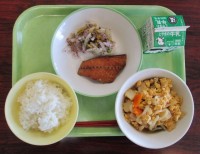 今日の献立は、 「ごはん、牛乳、さばのみそ煮、ゆかり和え、親子煮」でした。「親子煮」は、鶏肉と人参やじめじ、こんにゃく、じゃが芋などが甘めの味付けで卵でとじてあり、とてもおいしくいただきました。