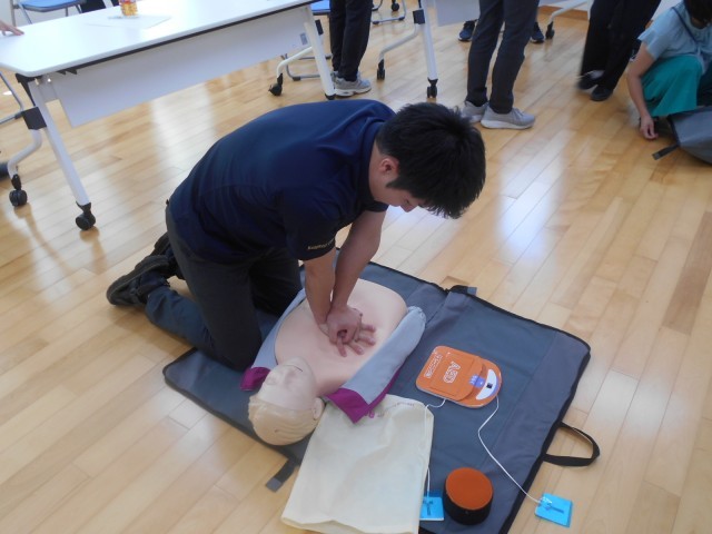 明日から夏季休業期間のため、部活動等の熱中症対応のために、養護教諭による救急救命講座を行いました。熱中症時の対応を確認したり、人形を用いて胸骨圧迫を練習したりしました。
