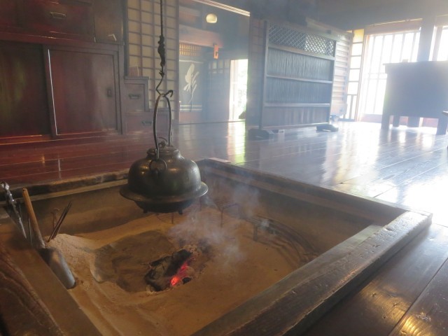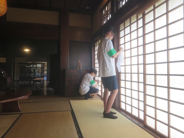 民芸合掌館で囲炉裏を炊きながら、障子戸を念入りに清掃中です。