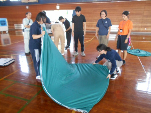 体育館は大変暑かったのですが、参加した先生方は万一に備えて、真剣に訓練に取り組んでいました。