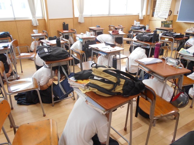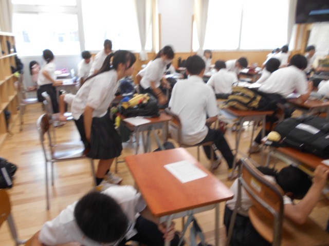 今日は防災の日。朝学活時、シェイクアウト訓練を行いました。生徒は「低く、頭を守り、動かない」という地震発生時に身を守る3原則をしっかりと実行していました。
