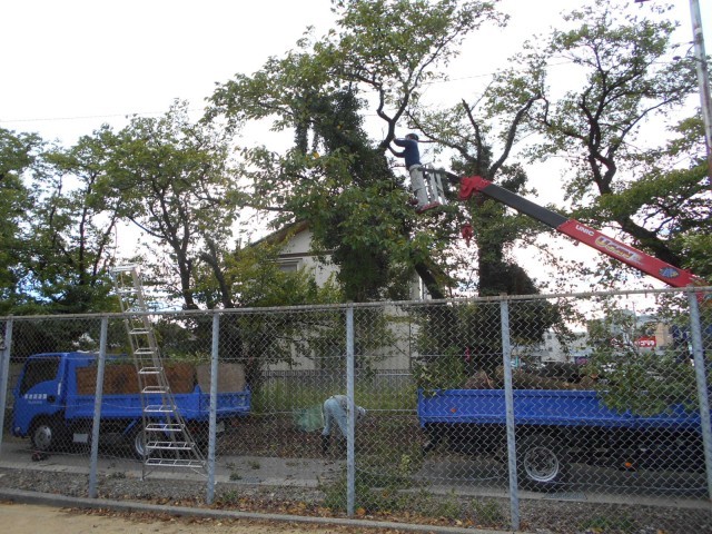 学校横の桜並木は五福方面からの生徒の通学路になっています。その桜が老木となり、枝が朽ちて落下する恐れがあるため、校区の市議さん、育成会や教育後援会の会長さんたちが市に対して伐採の要望をしていました。今日作業が行われ、当面心配と思われる枝を落としていただきました。生徒は安心して通行できるようになりました。関係方面の皆様、ありがとうございました。