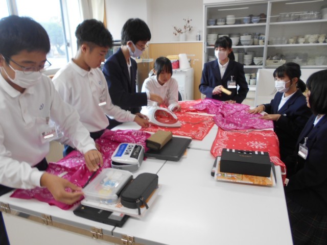 3組家庭科では、縫い物に取り組むようです。写真は布にアイロンがけするなど、準備しているようです。
