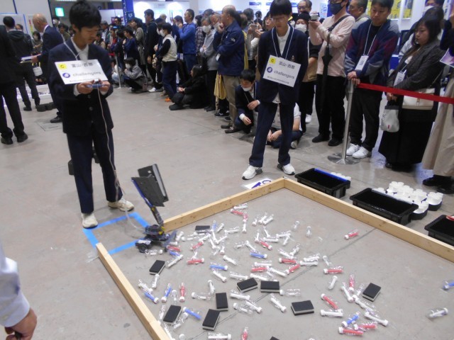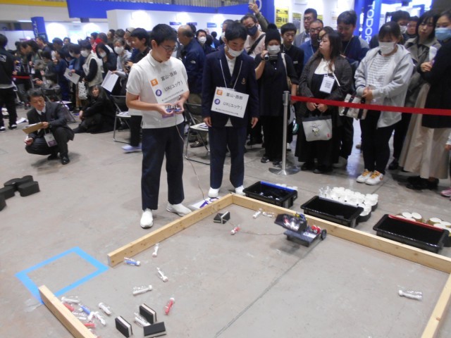 第22回富山県中学校ロボットコンテストが富山テクノホール(T-Messes2025内)で行われ、本校から2チーム参加しました。県内から18チームが参加し、熱戦を繰り広げました。どのチームもロボットに工夫や機能性を加えて、アイテムを獲得して得点を競いました。本校参加2チームの結果は以下の通りです