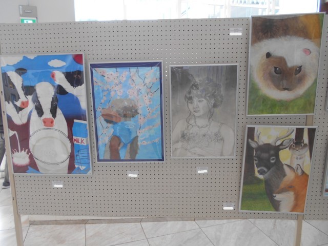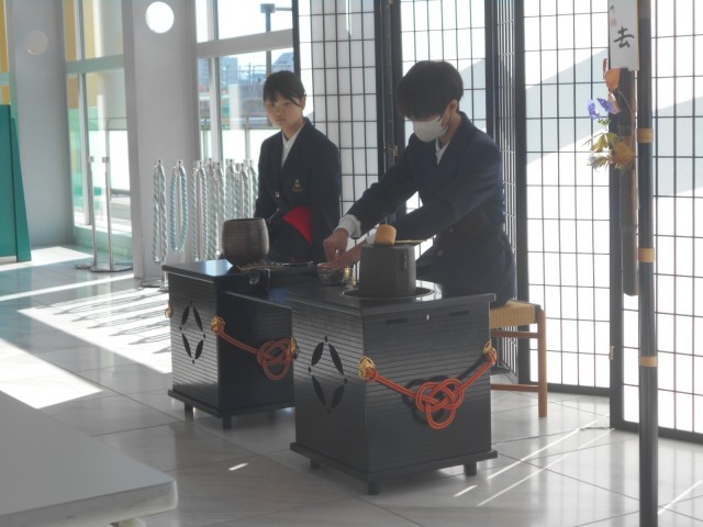 写真クリックして上から、茶道部のお茶席 点前・半東の様子、運びの様子、茶道部集合写真、美術部の作品その1、美術部の作品その2、書道作品、家庭科作品その1、家庭科作品その2